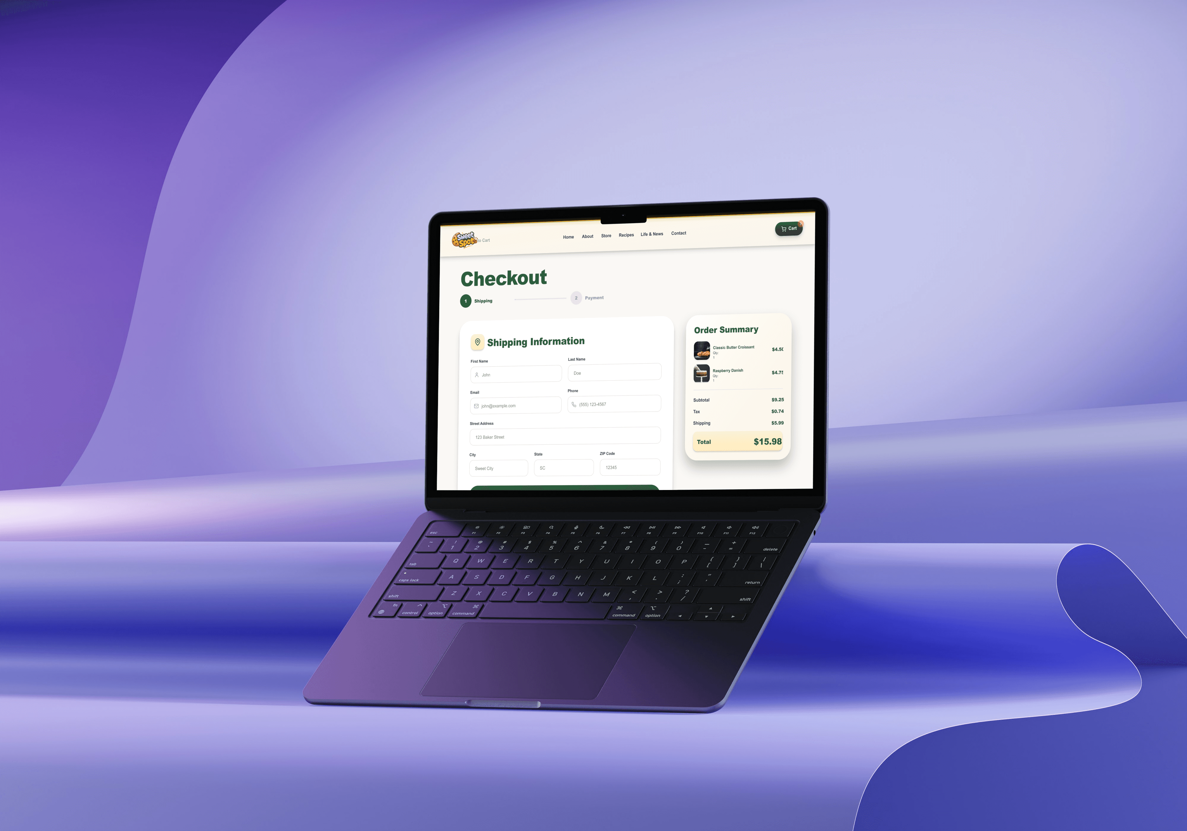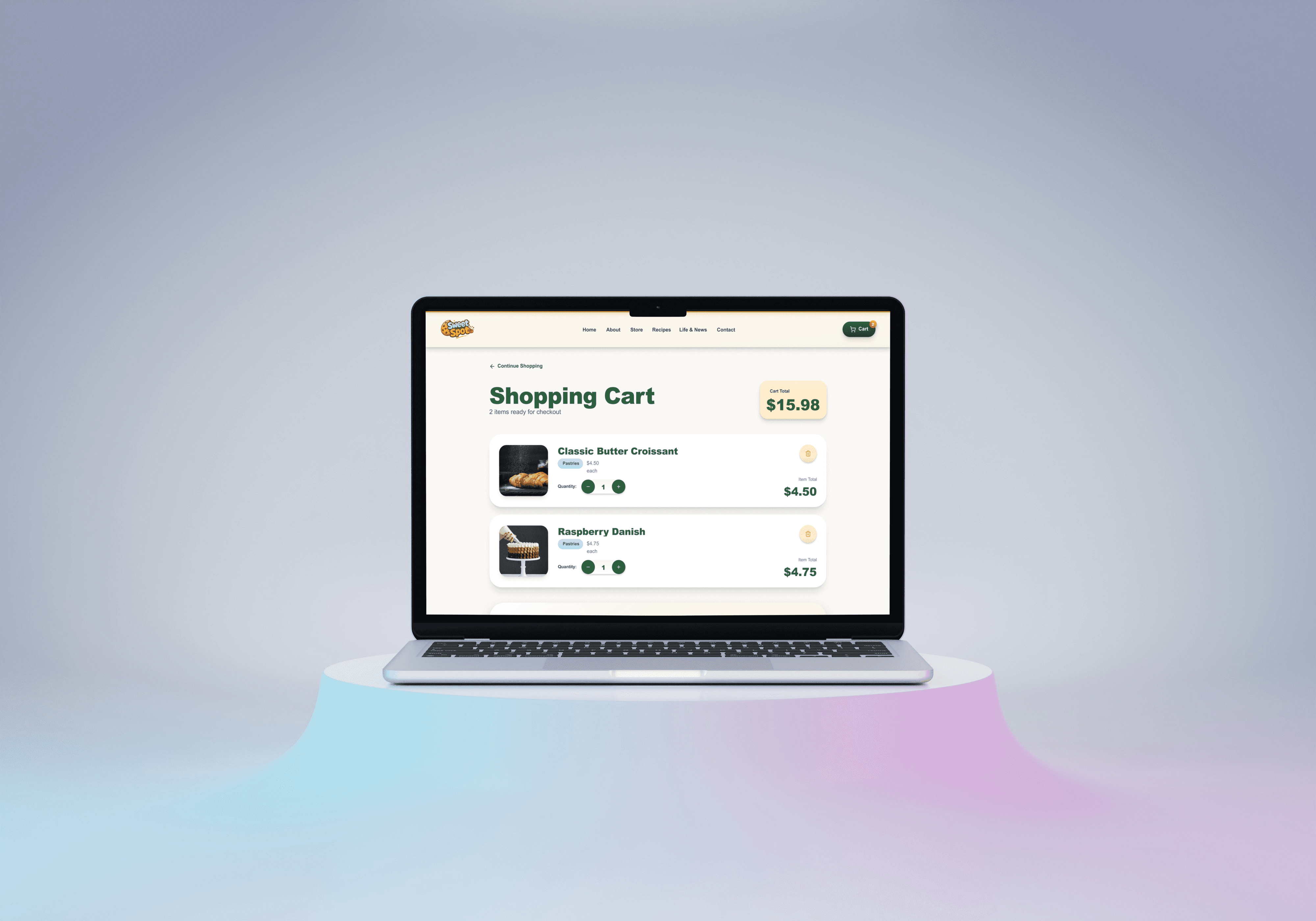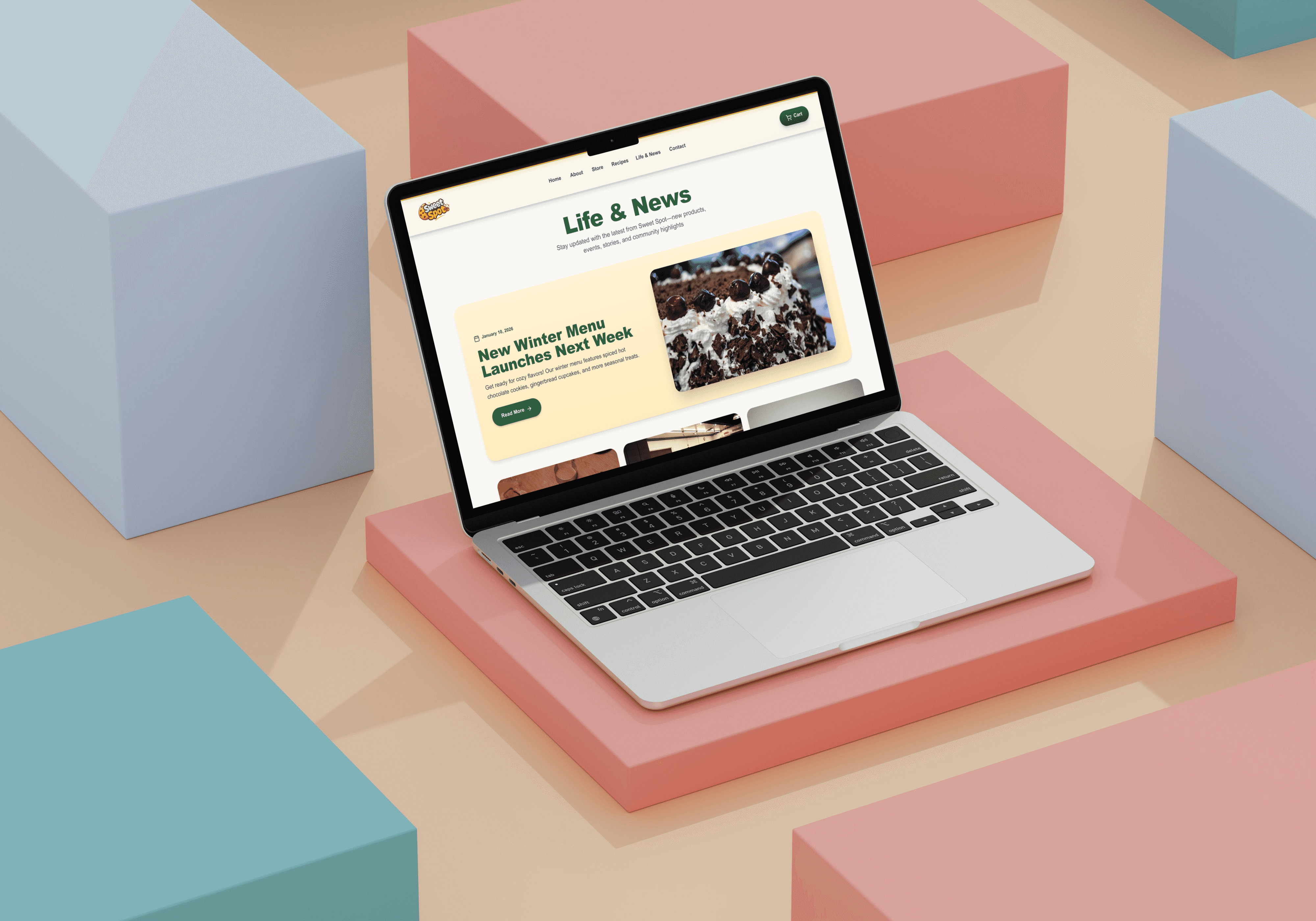 SweetSpot is a modern bakery website UI designed to showcase desserts, promote products, and support smooth online ordering through clean layouts and warm pastel visuals.